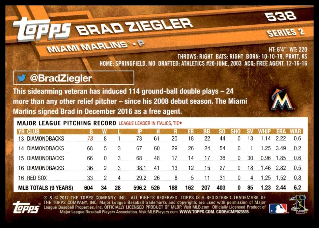 This BaseballΒ card, from 2017 is part of the Topps Series 2Β card set. Brad Ziegler is featured and has a card number of 538.