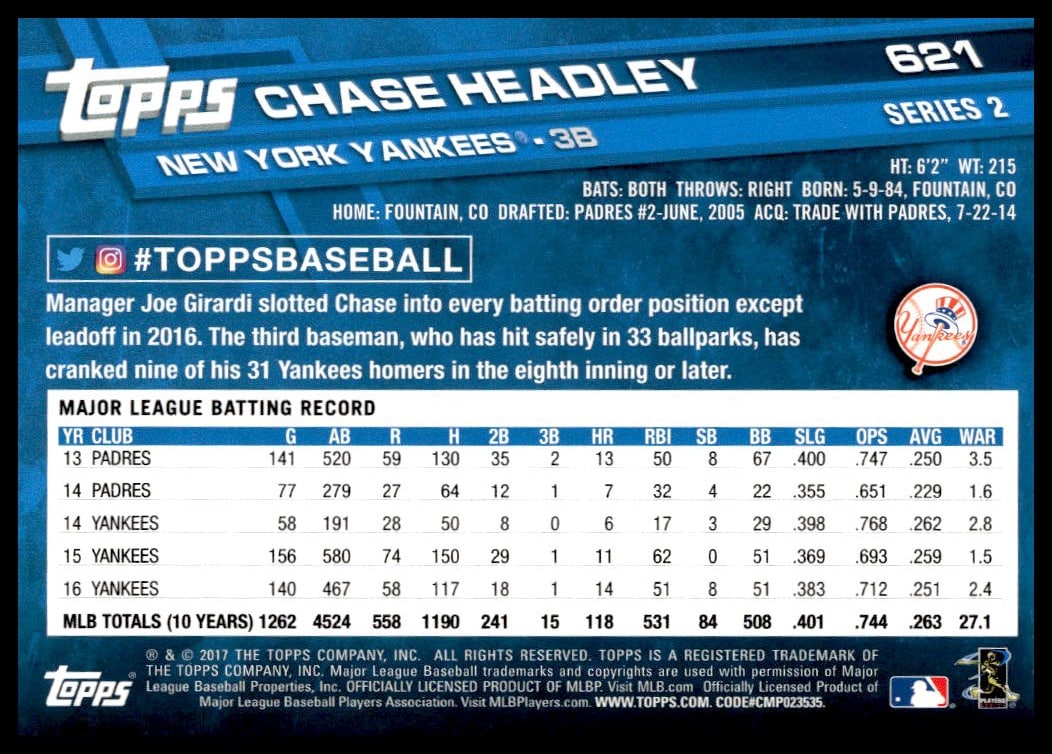 This Baseball card, from 2017 is part of the Topps Series 2 card set. Chase Headley is featured and has a card number of 621.