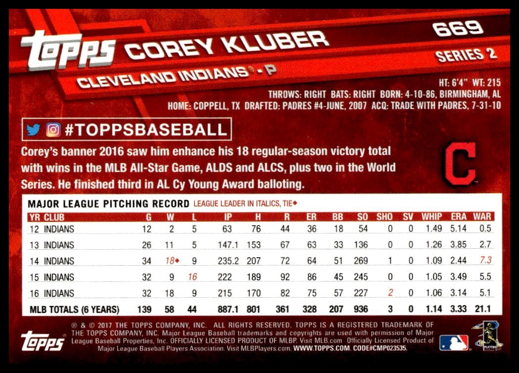 This BaseballΒ card, from 2017 is part of the Topps Series 2Β card set. Corey Kluber is featured and has a card number of 669.