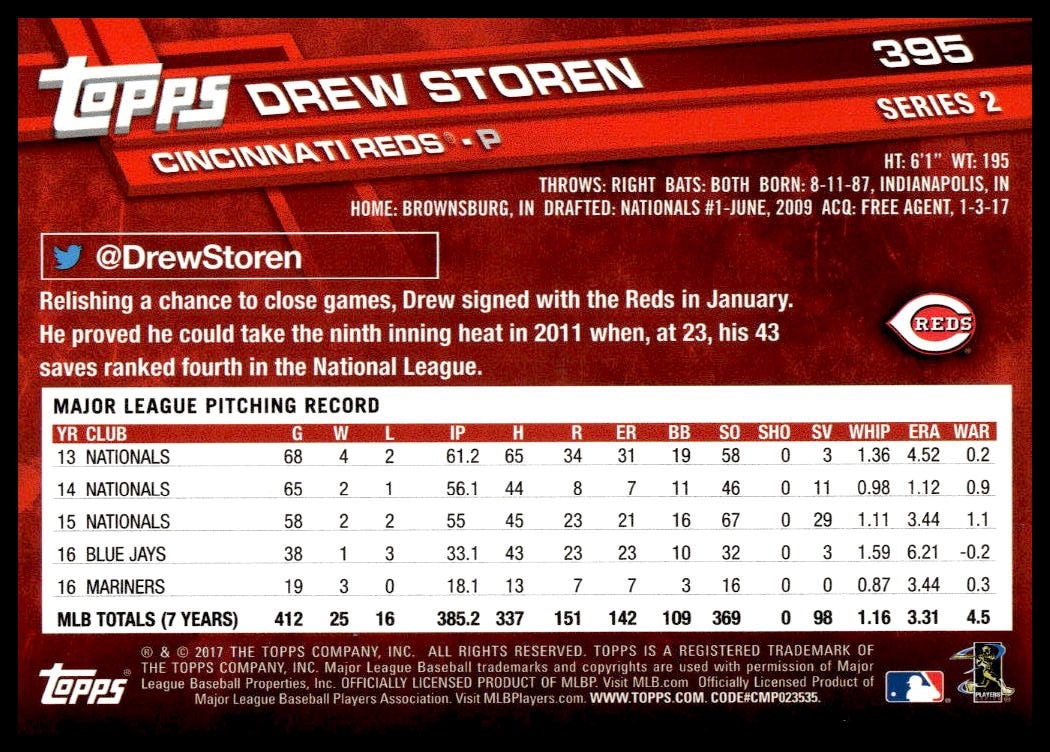 This BaseballΒ card, from 2017 is part of the Topps Series 2Β card set. Drew Storen is featured and has a card number of 395.