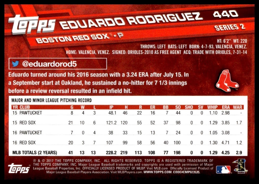 This Baseball card, from 2017 is part of the Topps Series 2 card set. Eduardo Rodriguez is featured and has a card number of 440.
