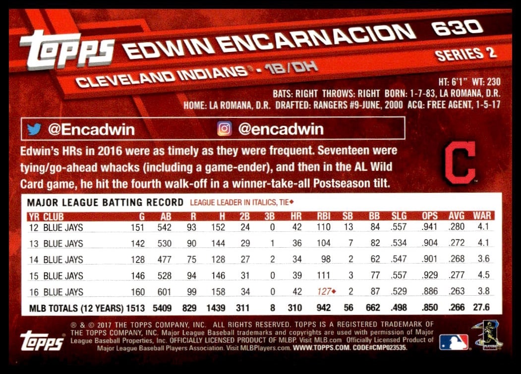 This Baseball card, from 2017 is part of the Topps Series 2 card set. Edwin Encarnacion is featured and has a card number of 630.