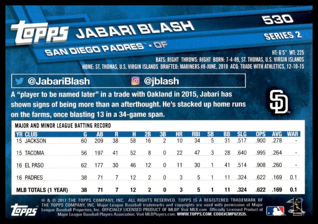 This BaseballΒ card, from 2017 is part of the Topps Series 2Β card set. Jabari Blash is featured and has a card number of 530.