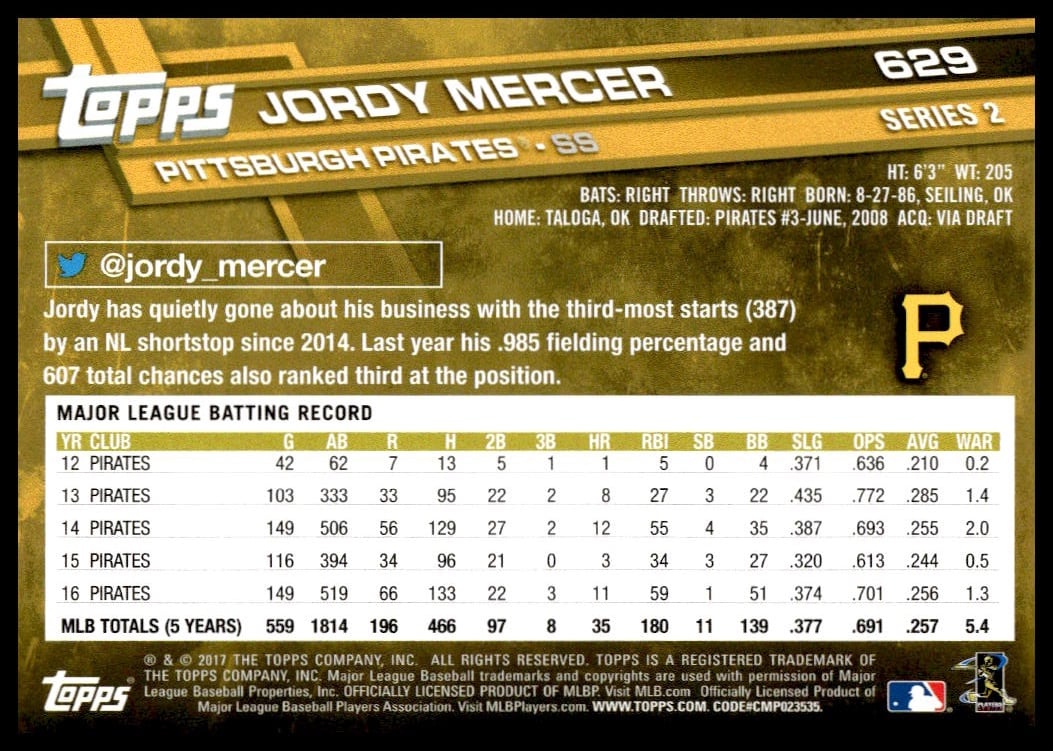 This BaseballΒ card, from 2017 is part of the Topps Series 2Β card set. Jordy Mercer is featured and has a card number of 629.