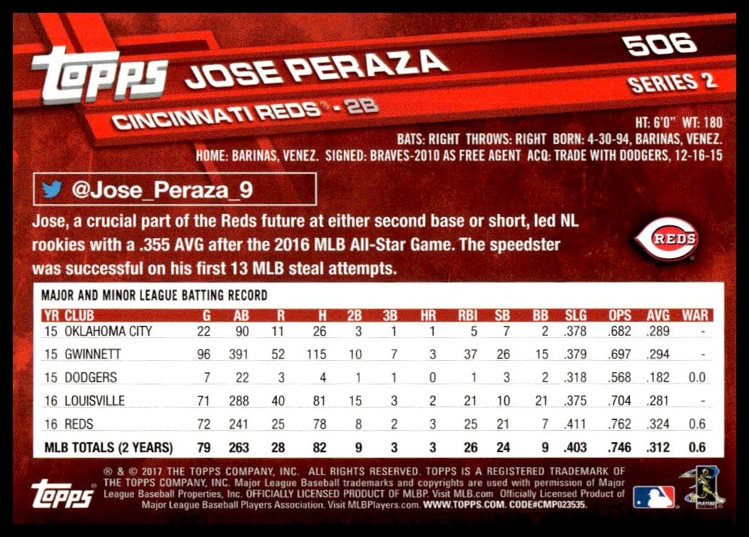 This Baseball card, from 2017 is part of the Topps Series 2 card set. Jose Peraza is featured and has a card number of 506.