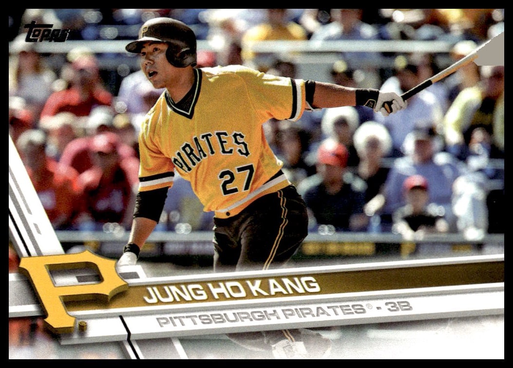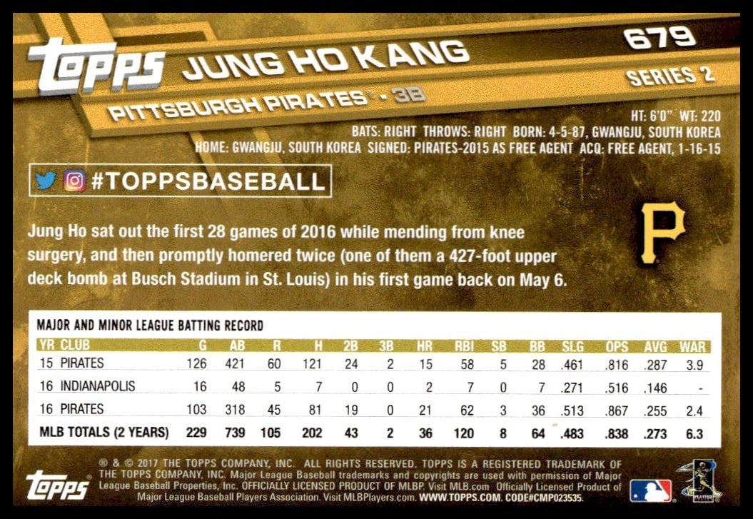 This Baseball card, from 2017 is part of the Topps Series 2 card set. Jung Ho Kang is featured and has a card number of 679.