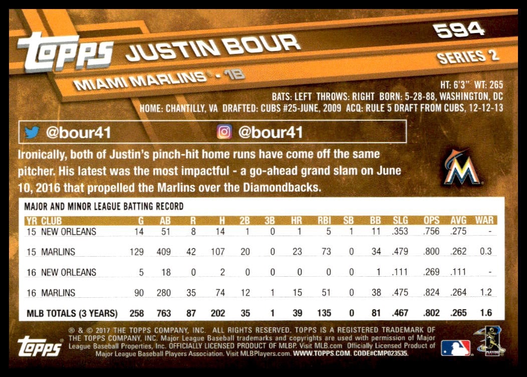 This BaseballΒ card, from 2017 is part of the Topps Series 2Β card set. Justin Bour is featured and has a card number of 594.