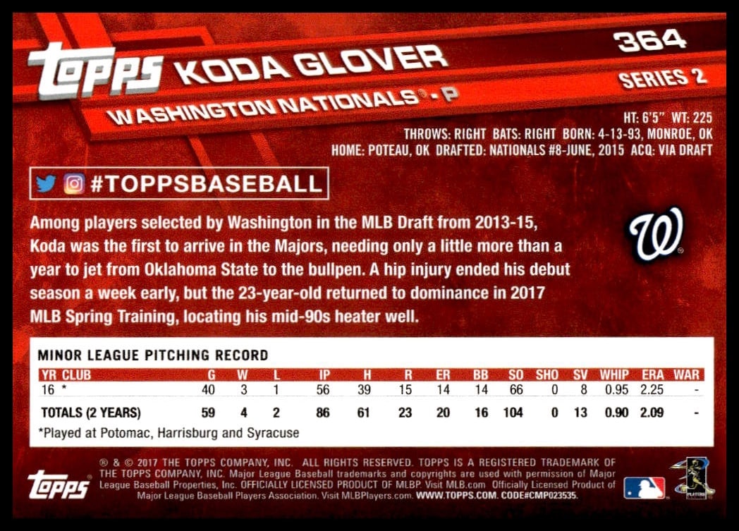 This BaseballΒ card, from 2017 is part of the Topps Series 2Β card set. Koda Glover is featured and has a card number of 364.