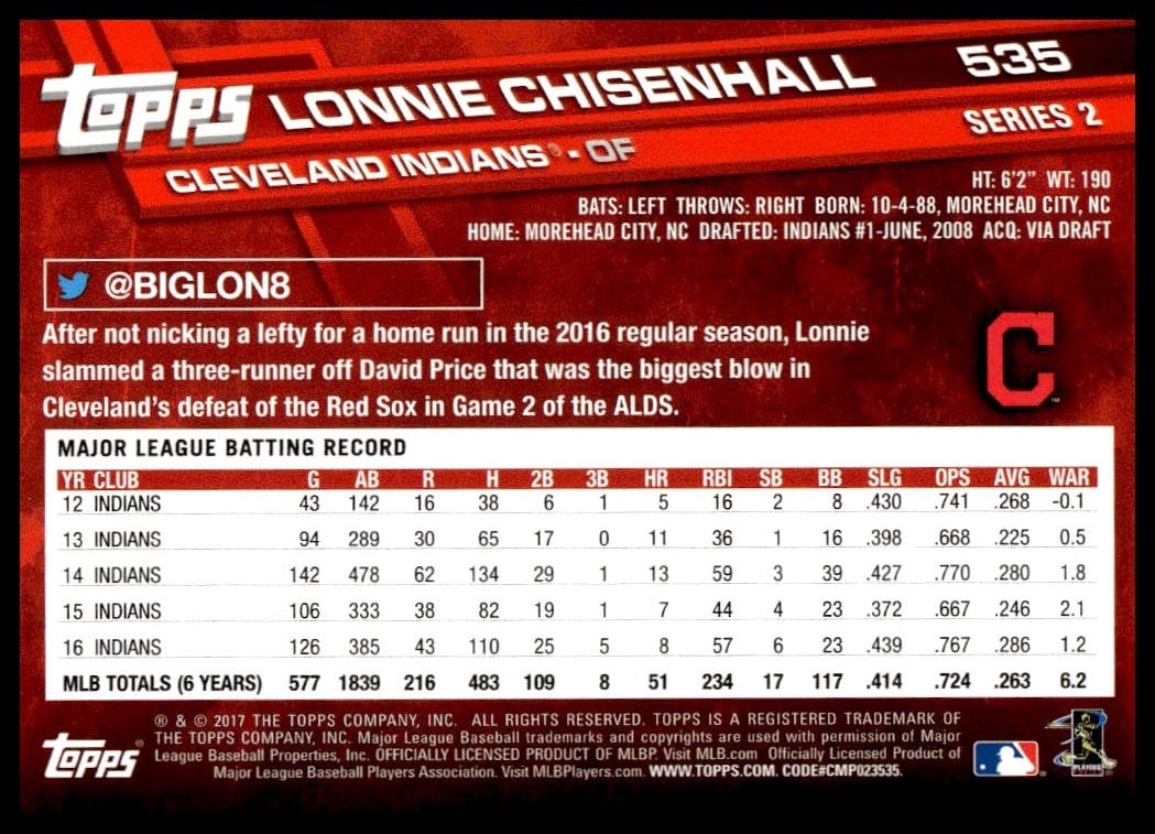 This BaseballΒ card, from 2017 is part of the Topps Series 2Β card set. Lonnie Chisenhall is featured and has a card number of 535.