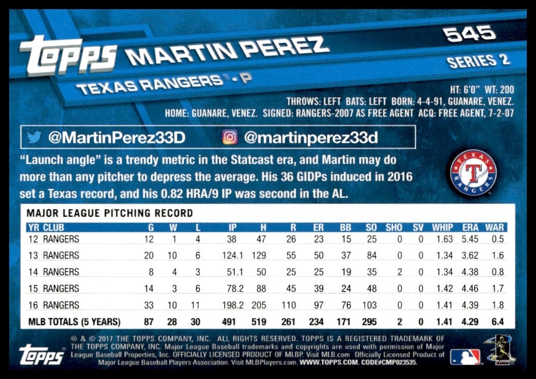 This Baseball card, from 2017 is part of the Topps Series 2 card set. Martin Perez is featured and has a card number of 545.
