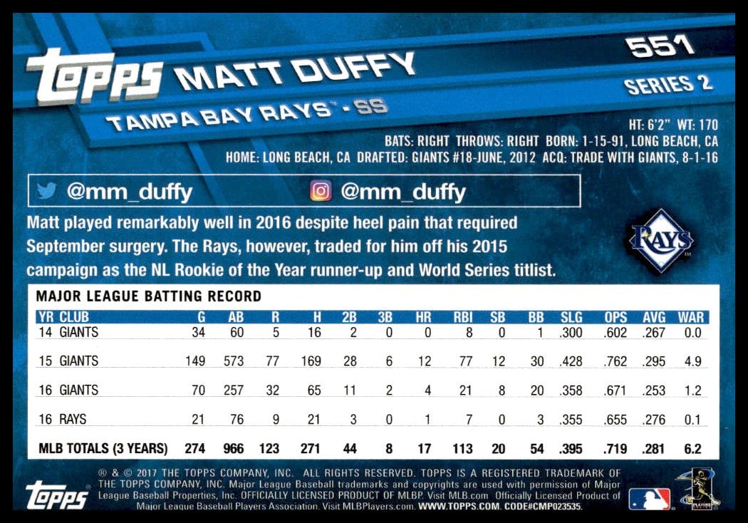 This BaseballΒ card, from 2017 is part of the Topps Series 2Β card set. Matt Duffy is featured and has a card number of 551.