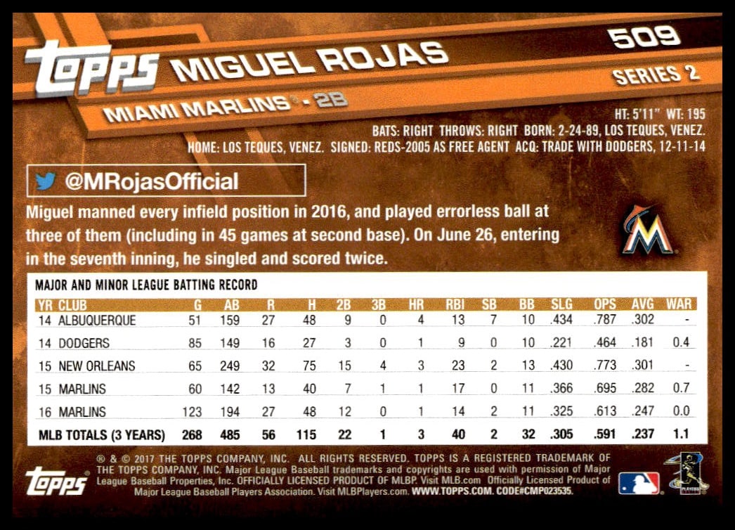 This BaseballΒ card, from 2017 is part of the Topps Series 2Β card set. Miguel Rojas is featured and has a card number of 509.