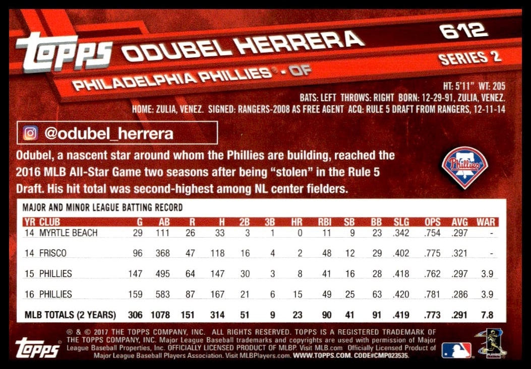 This BaseballΒ card, from 2017 is part of the Topps Series 2Β card set. Odubel Herrera is featured and has a card number of 612.
