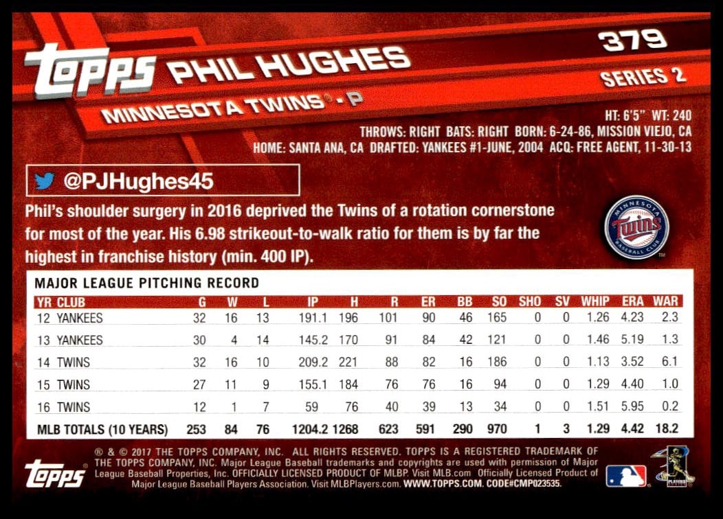 This BaseballΒ card, from 2017 is part of the Topps Series 2Β card set. Phil Hughes is featured and has a card number of 379.