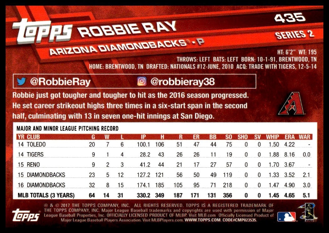This Baseball card, from 2017 is part of the Topps Series 2 card set. Robbie Ray is featured and has a card number of 435.