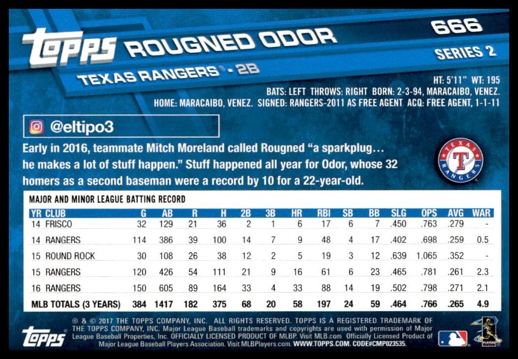 This BaseballΒ card, from 2017 is part of the Topps Series 2Β card set. Rougned Odor is featured and has a card number of 666.