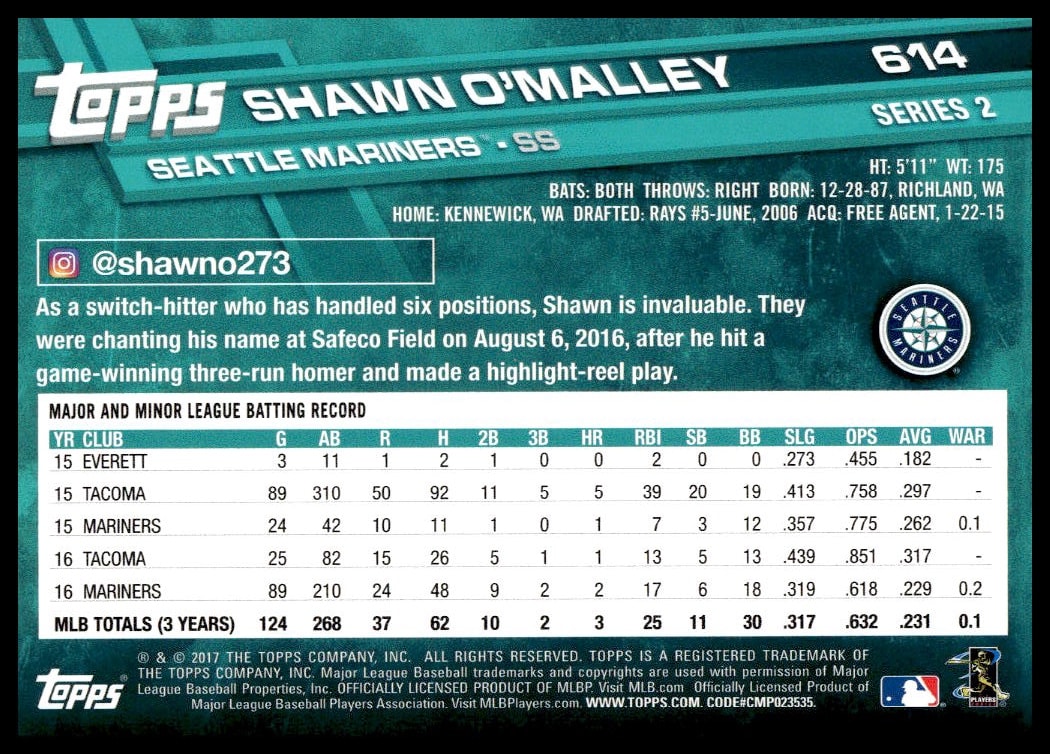 This Baseball card, from 2017 is part of the Topps Series 2 card set. Shawn O’Malley is featured and has a card number of 614.