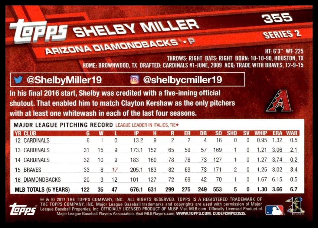 This Baseball card, from 2017 is part of the Topps Series 2 card set. Shelby Miller is featured and has a card number of 355.