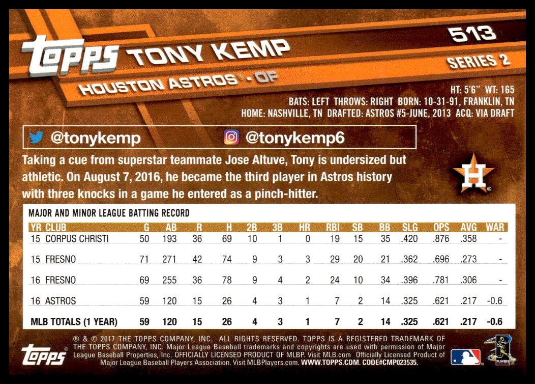 This BaseballΒ card, from 2017 is part of the Topps Series 2Β card set. Tony Kemp is featured and has a card number of 513.