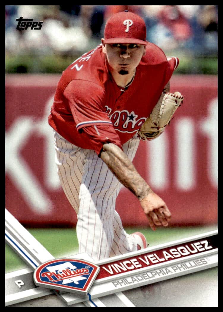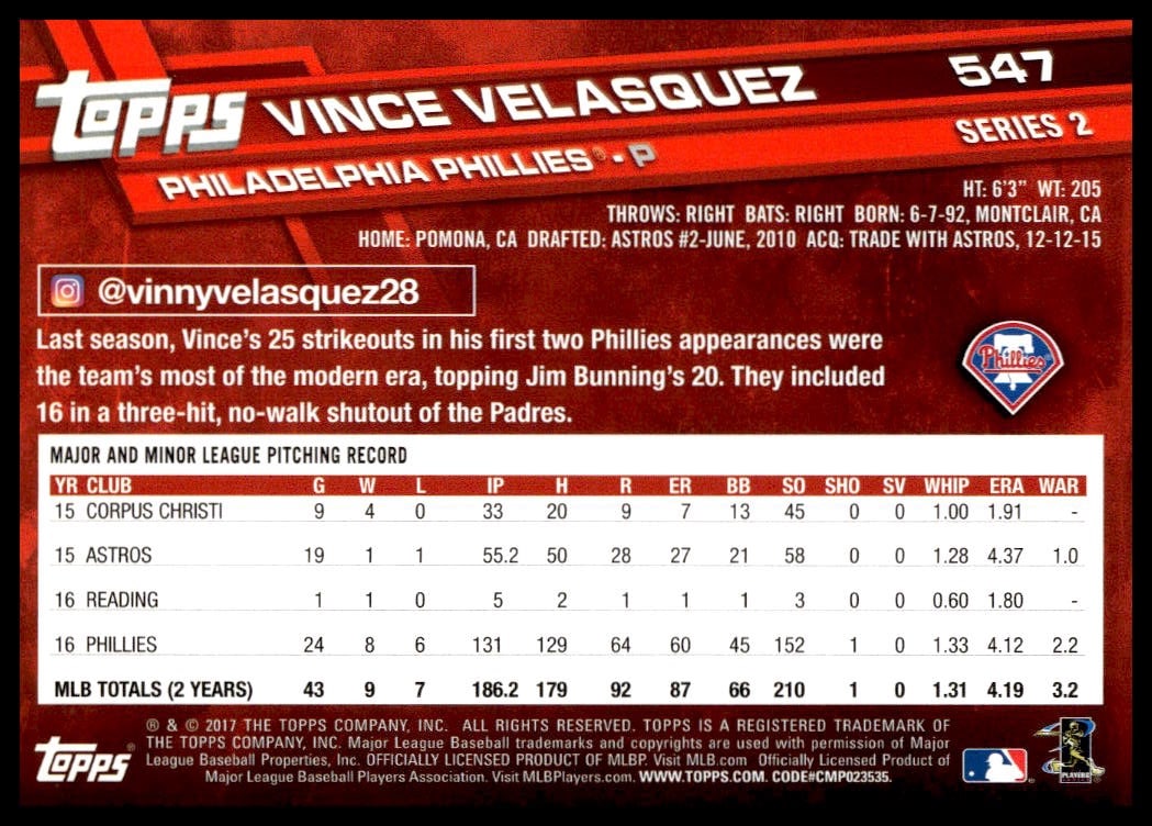 This Baseball card, from 2017 is part of the Topps Series 2 card set. Vince Velasquez is featured and has a card number of 547.