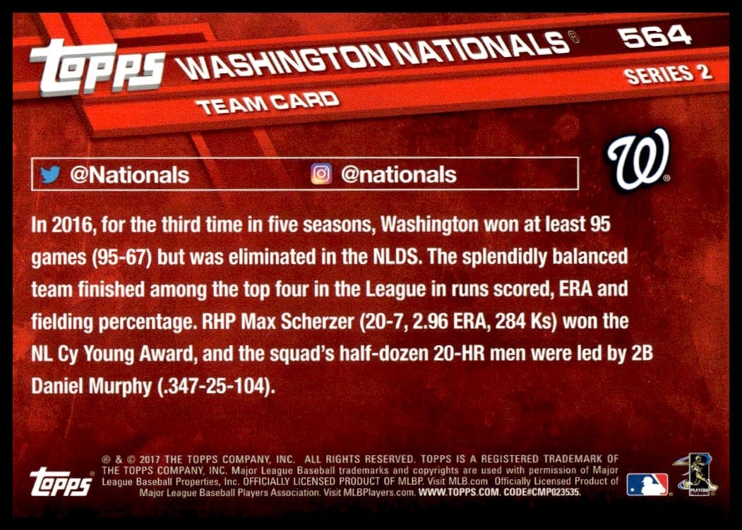 This BaseballΒ card, from 2017 is part of the Topps Series 2Β card set. Washington Nationals is featured and has a card number of 564.