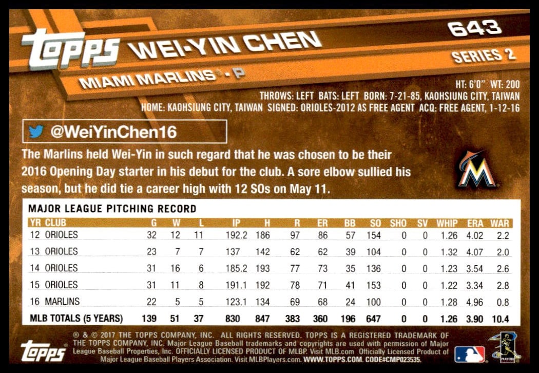 This Baseball card, from 2017 is part of the Topps Series 2 card set. Wei-Yin Chen is featured and has a card number of 643.