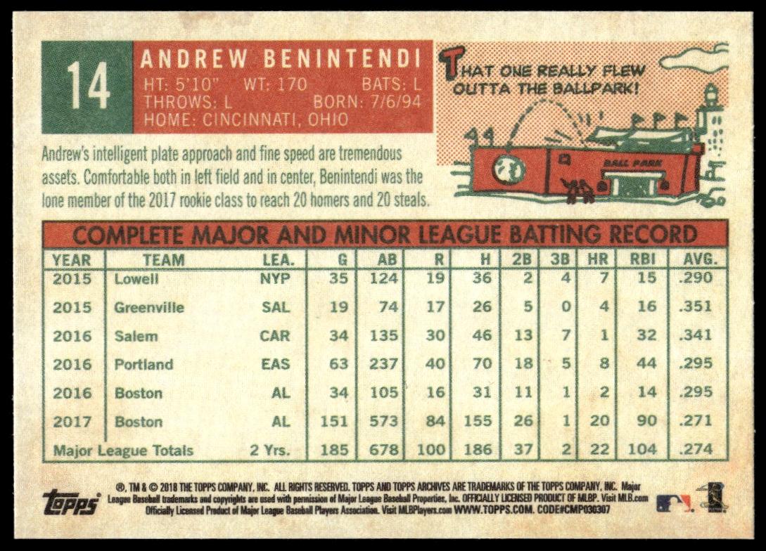 This Baseball card, from 2018 is part of the Topps Archives card set. Andrew Benintendi is featured and has a card number of 14.