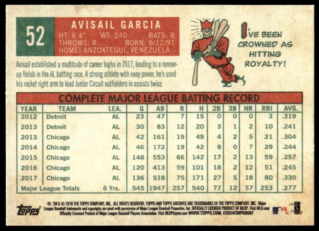 This Baseball card, from 2018 is part of the Topps Archives card set. Avisail Garcia is featured and has a card number of 52.