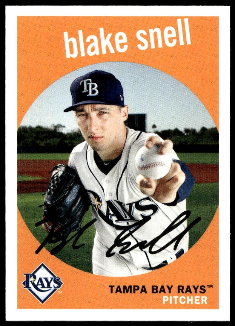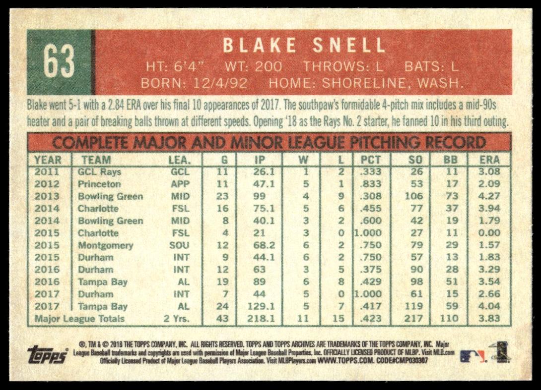 This Baseball card, from 2018 is part of the Topps Archives card set. Blake Snell is featured and has a card number of 63.