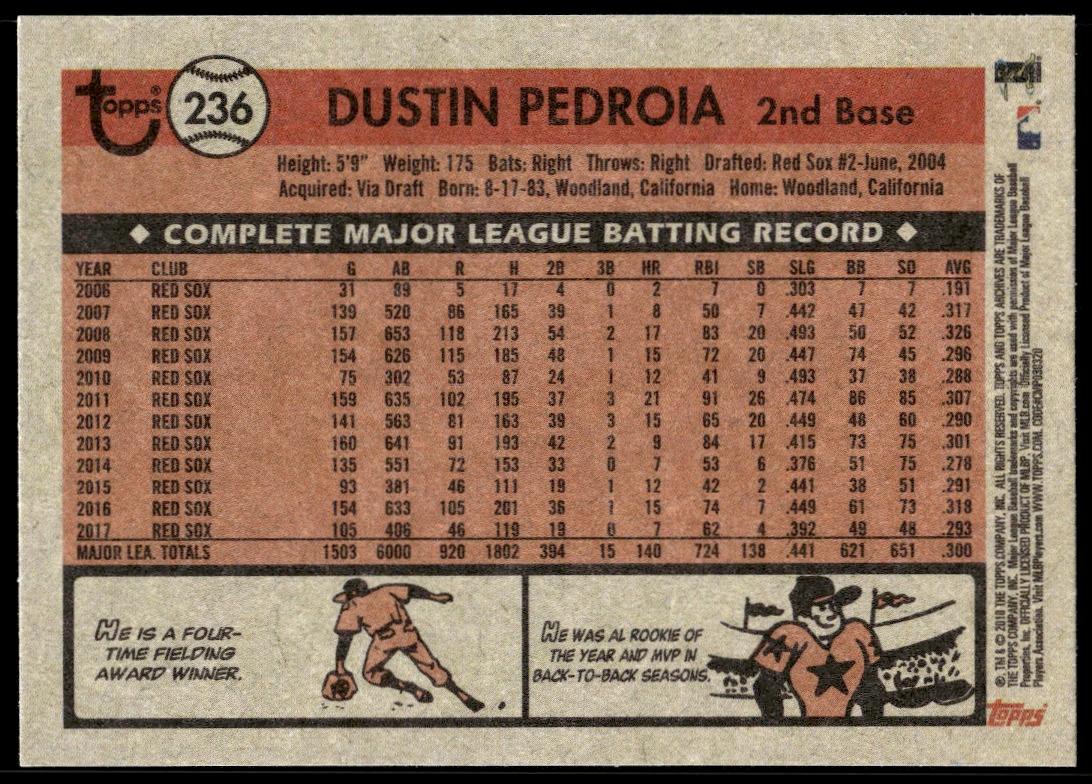 This BaseballΒ card, from 2018 is part of the Topps ArchivesΒ card set. Dustin Pedroia is featured and has a card number of 236.