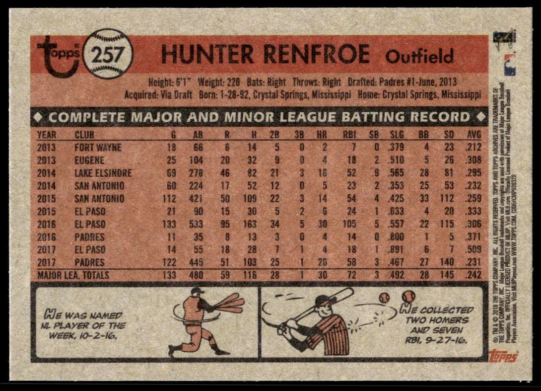 This Baseball card, from 2018 is part of the Topps Archives card set. Hunger Renfroe is featured and has a card number of 257.