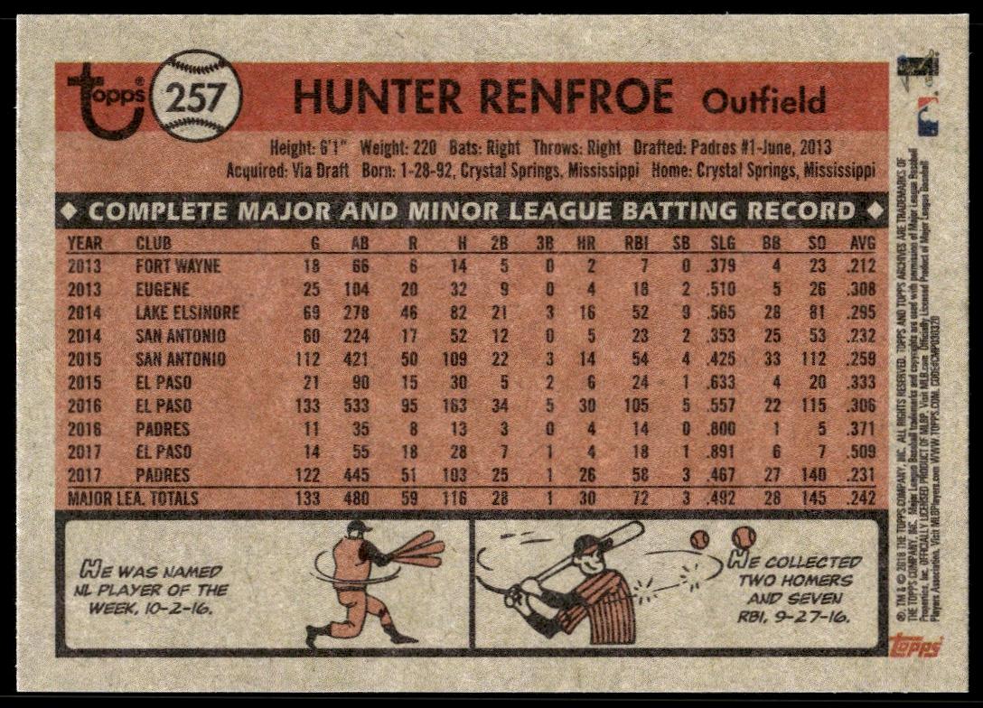 This Baseball card, from 2018 is part of the Topps Archives card set. Hunter Renfroe is featured and has a card number of 257.