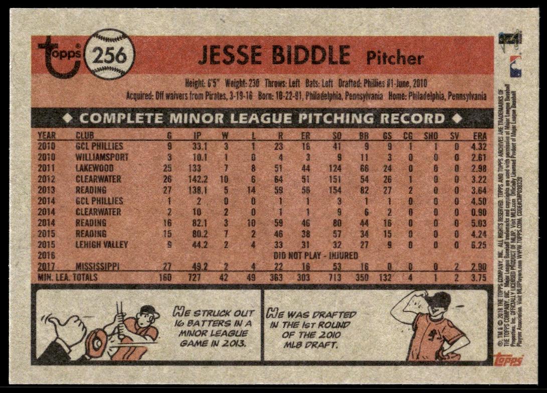 This BaseballΒ card, from 2018 is part of the Topps ArchivesΒ card set. Jesse Biddle is featured and has a card number of 256.