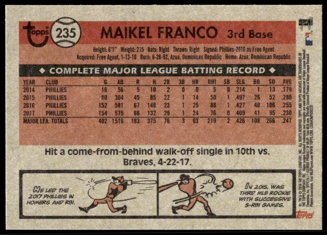 This BaseballΒ card, from 2018 is part of the Topps ArchivesΒ card set. Maikel Franco is featured and has a card number of 235.