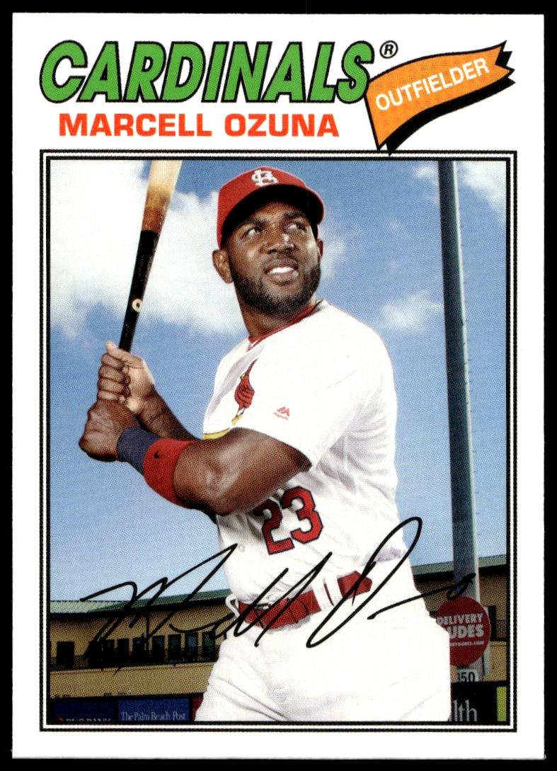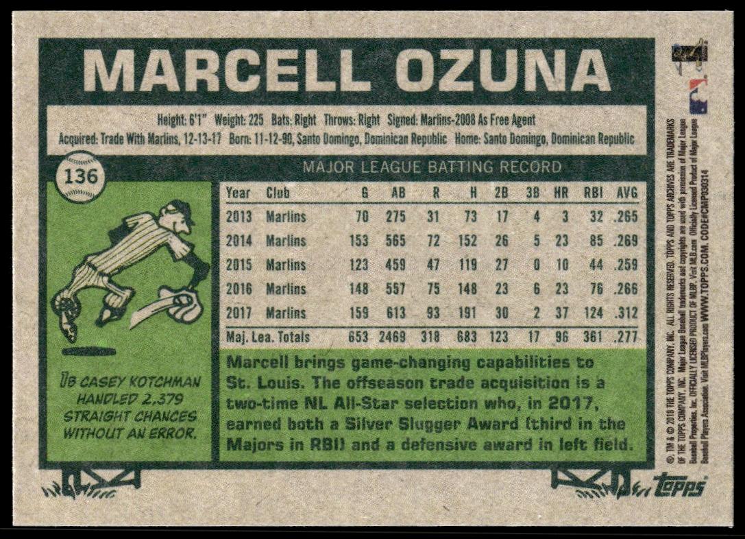 This Baseball card, from 2018 is part of the Topps Archives card set. Marcell Ozuna is featured and has a card number of 136.
