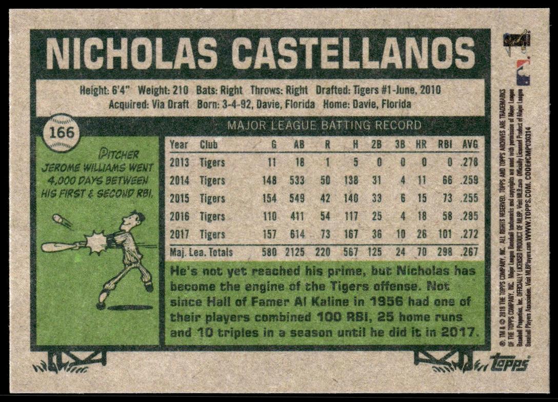 This BaseballΒ card, from 2018 is part of the Topps ArchivesΒ card set. Nicholas Castellanos is featured and has a card number of 166.