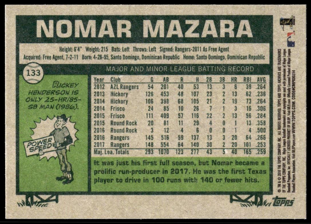This Baseball card, from 2018 is part of the Topps Archives card set. Nomar Mazara is featured and has a card number of 133.