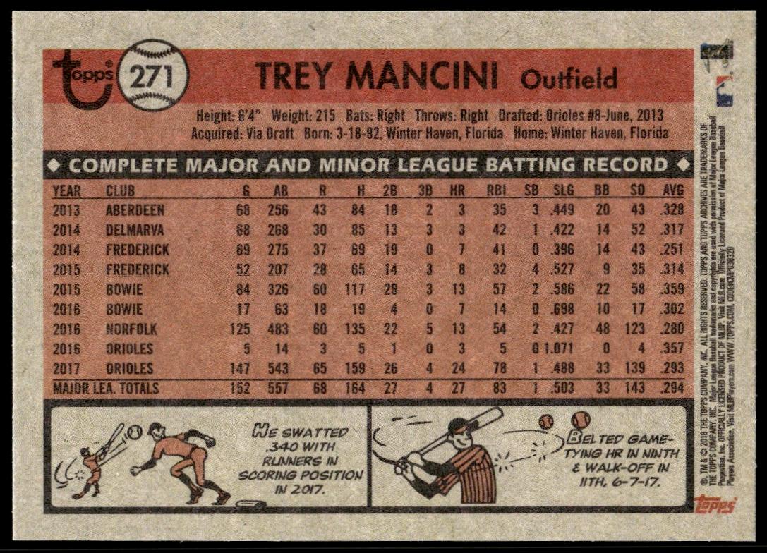 This BaseballΒ card, from 2018 is part of the Topps ArchivesΒ card set. Trey Mancini is featured and has a card number of 271.
