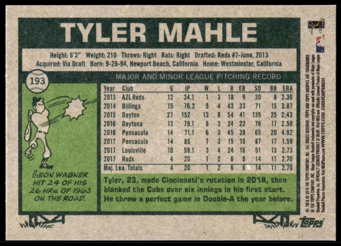 This Baseball card, from 2018 is part of the Topps Archives card set. Tyler Mahle is featured and has a card number of 193.
