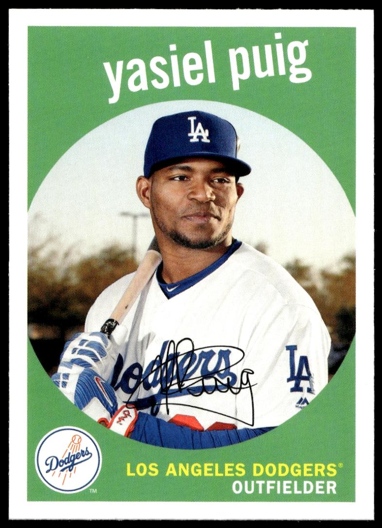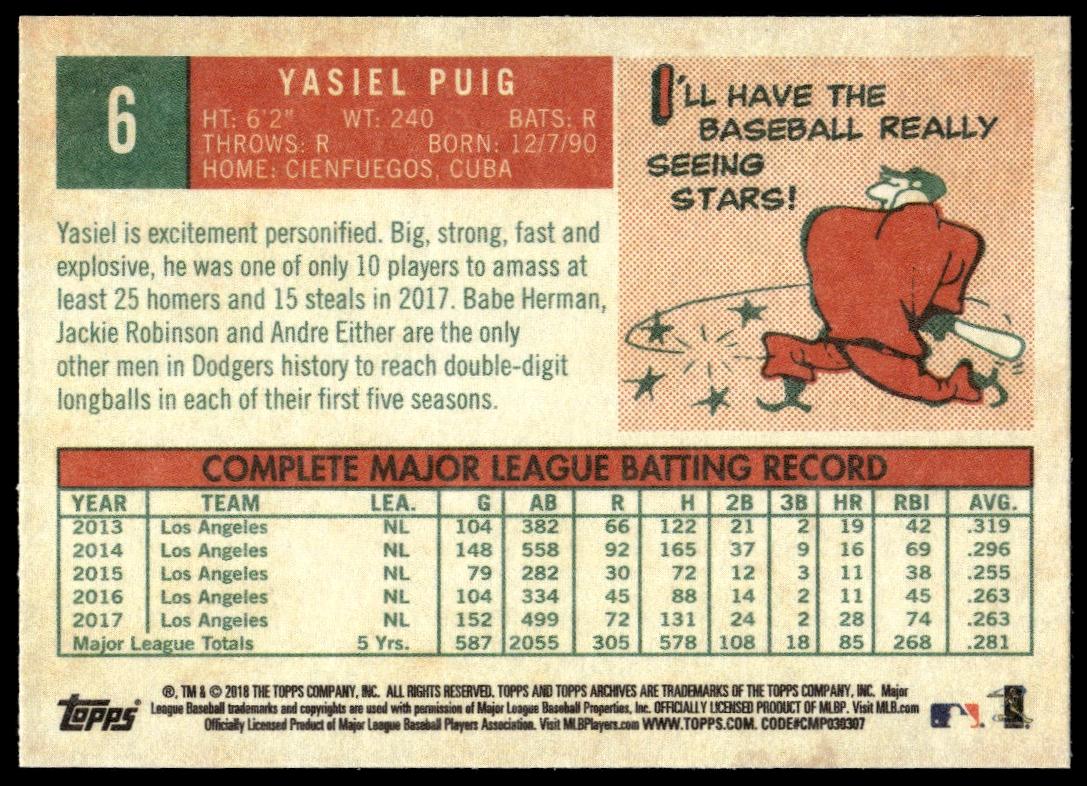 This BaseballΒ card, from 2018 is part of the Topps ArchivesΒ card set. Yasiel Puig is featured and has a card number of 6.