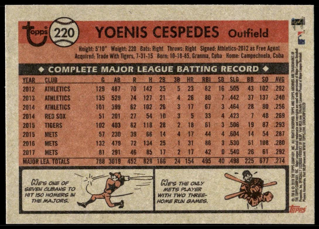 This BaseballΒ card, from 2018 is part of the Topps ArchivesΒ card set. Yoenis Cespedes is featured and has a card number of 220.
