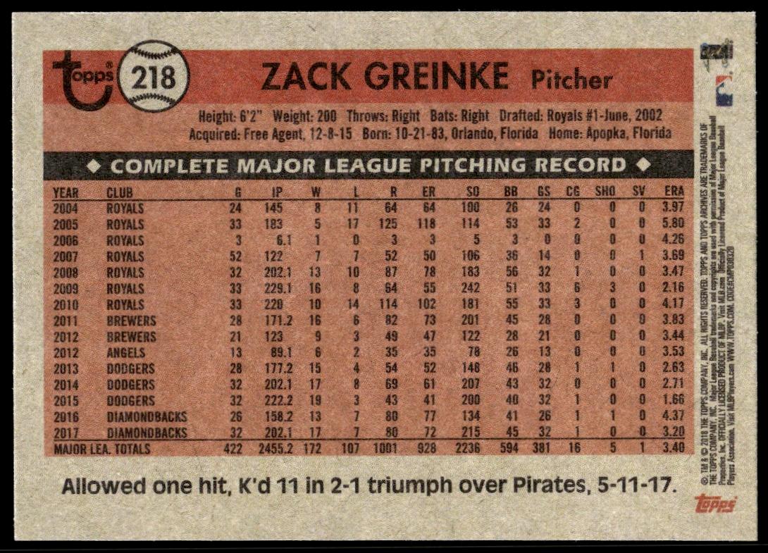This Baseball card, from 2018 is part of the Topps Archives card set. Zack Greinke is featured and has a card number of 218.