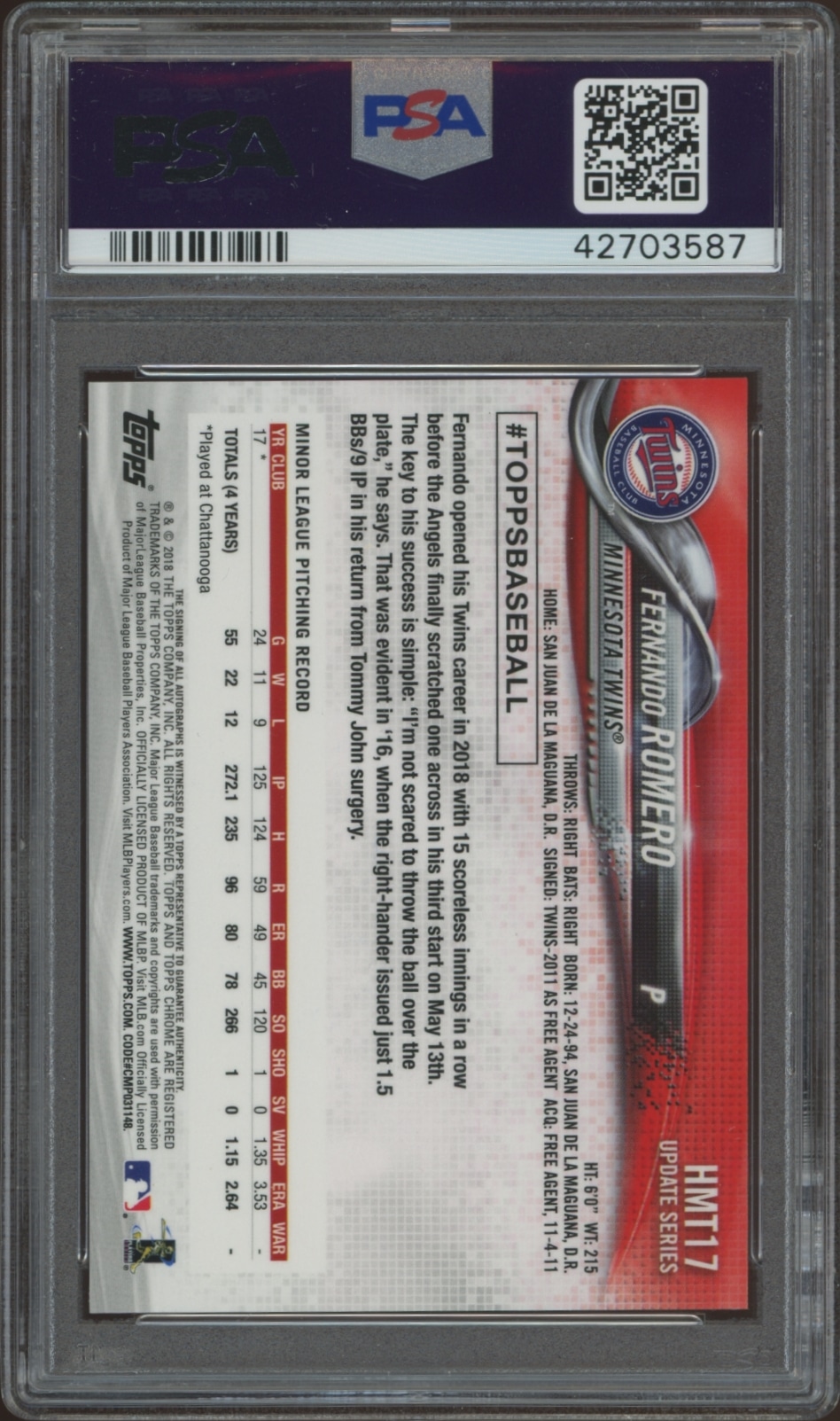 This Baseball card, from 2018 is part of the Topps Chrome Updatecard set. Fernando Romero is featured and has a card number of HMT17. It is graded by PSA and has a numeric grade of 10.