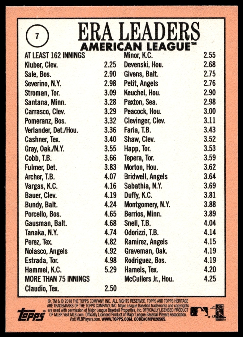 This Baseball card, from 2018 is part of the Topps Heritage card set. 2017 A.L. ERA Leaders (Corey Kluber / Chris Sale / Luis Severino) is featured and has a card number of 7.