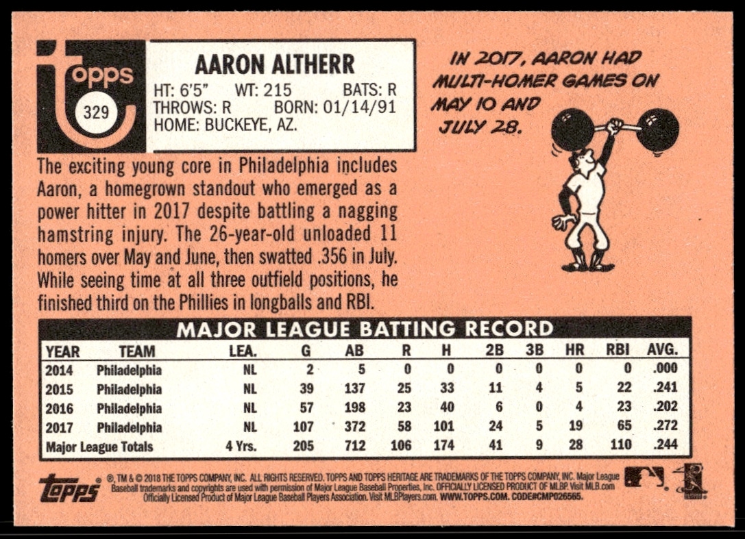 This Baseball card, from 2018 is part of the Topps Heritage card set. Aaron Altherr is featured and has a card number of 329.