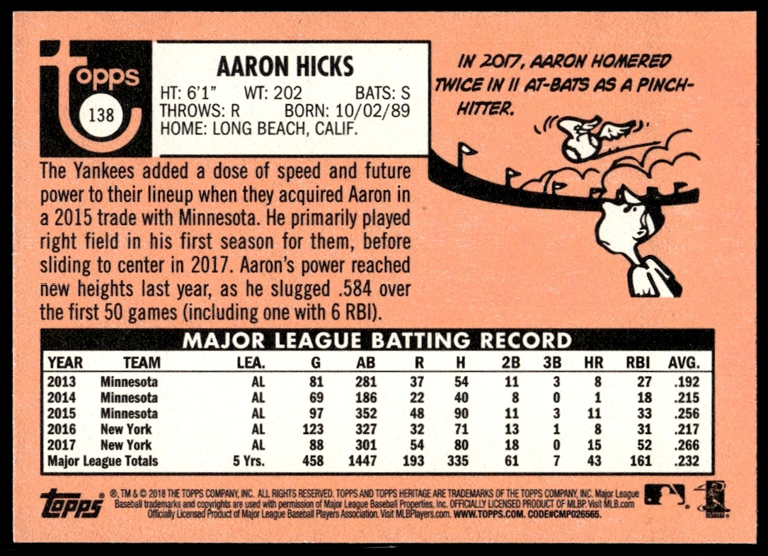 This BaseballΒ card, from 2018 is part of the Topps HeritageΒ card set. Aaron Hicks is featured and has a card number of 138.
