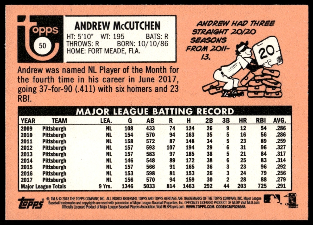 This Baseball card, from 2018 is part of the Topps Heritage card set. Andrew McCutchen is featured and has a card number of 50.