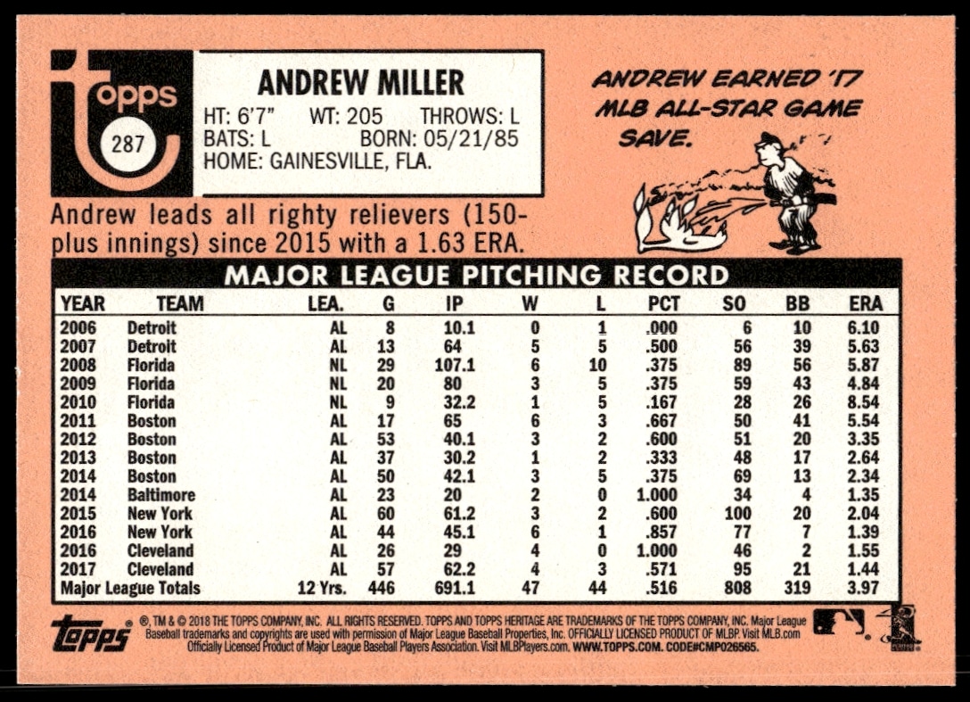 This BaseballΒ card, from 2018 is part of the Topps HeritageΒ card set. Andrew Miller is featured and has a card number of 287.