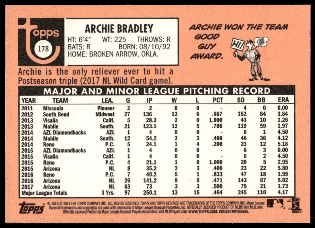 This Baseball card, from 2018 is part of the Topps Heritage card set. Archie Bradley is featured and has a card number of 178.