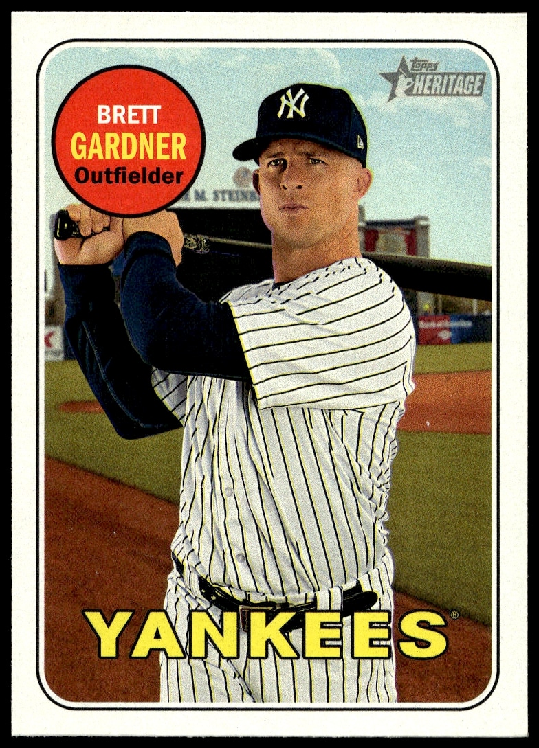 This Baseball card, from 2018 is part of the Topps Heritage card set. Brett Gardner is featured and has a card number of 215.